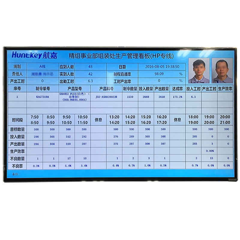 傳統電子看板使用LED屏,顯示數據少,內容單一,并且無法將多條產線組成網絡,進行集中管理和數據存儲。我司研發的液晶電子看板,采用高分辨率,顯示內容豐富,色彩和布局可根據客戶喜好進行設計,同時可通過以太網/無線網絡將工廠內的所有電子看板進行集中管理,并且將實時的生產數據上傳到服務器,管理人員在辦公室就可以實時查看生產進度看板,返修率等數據。